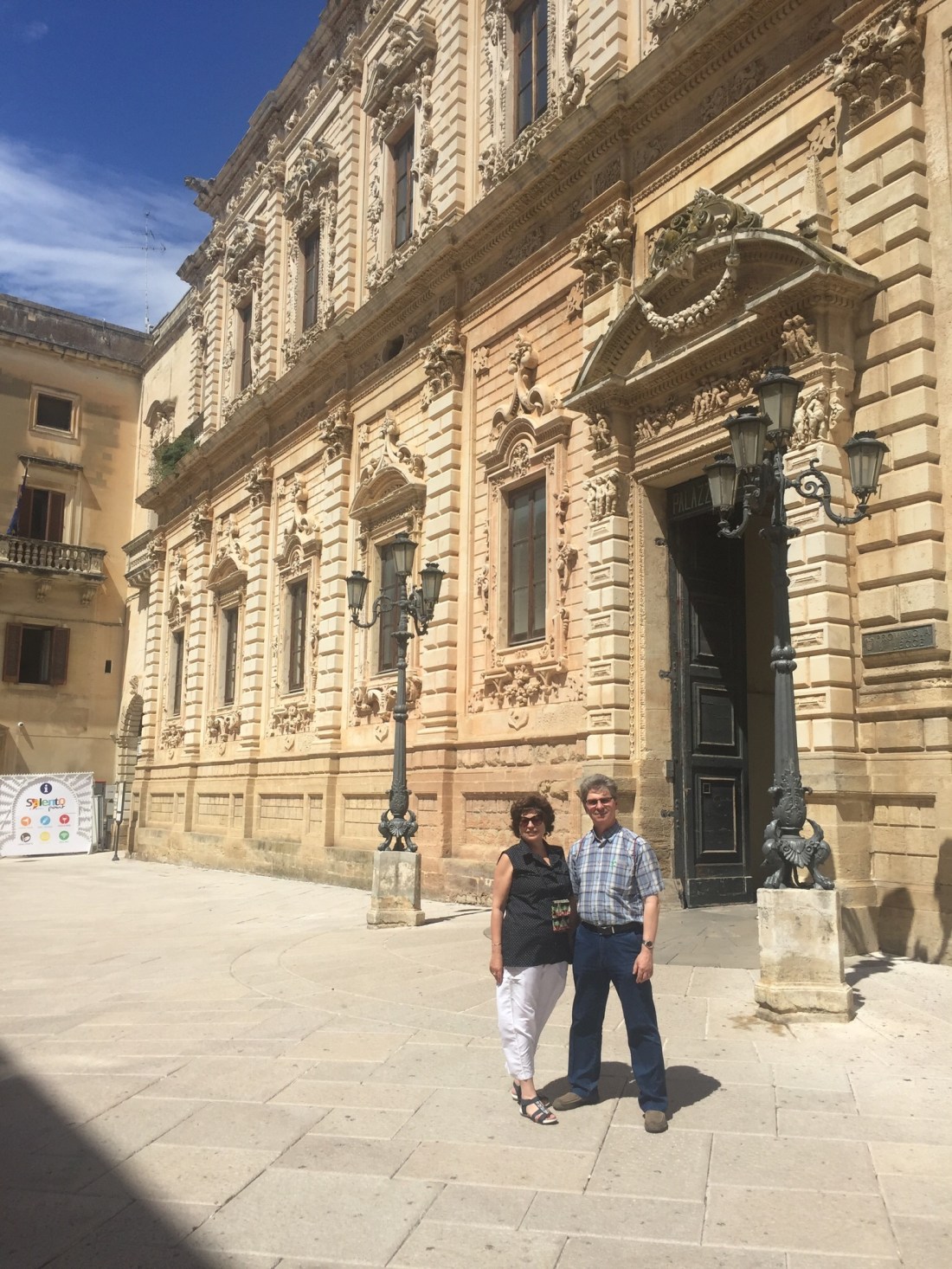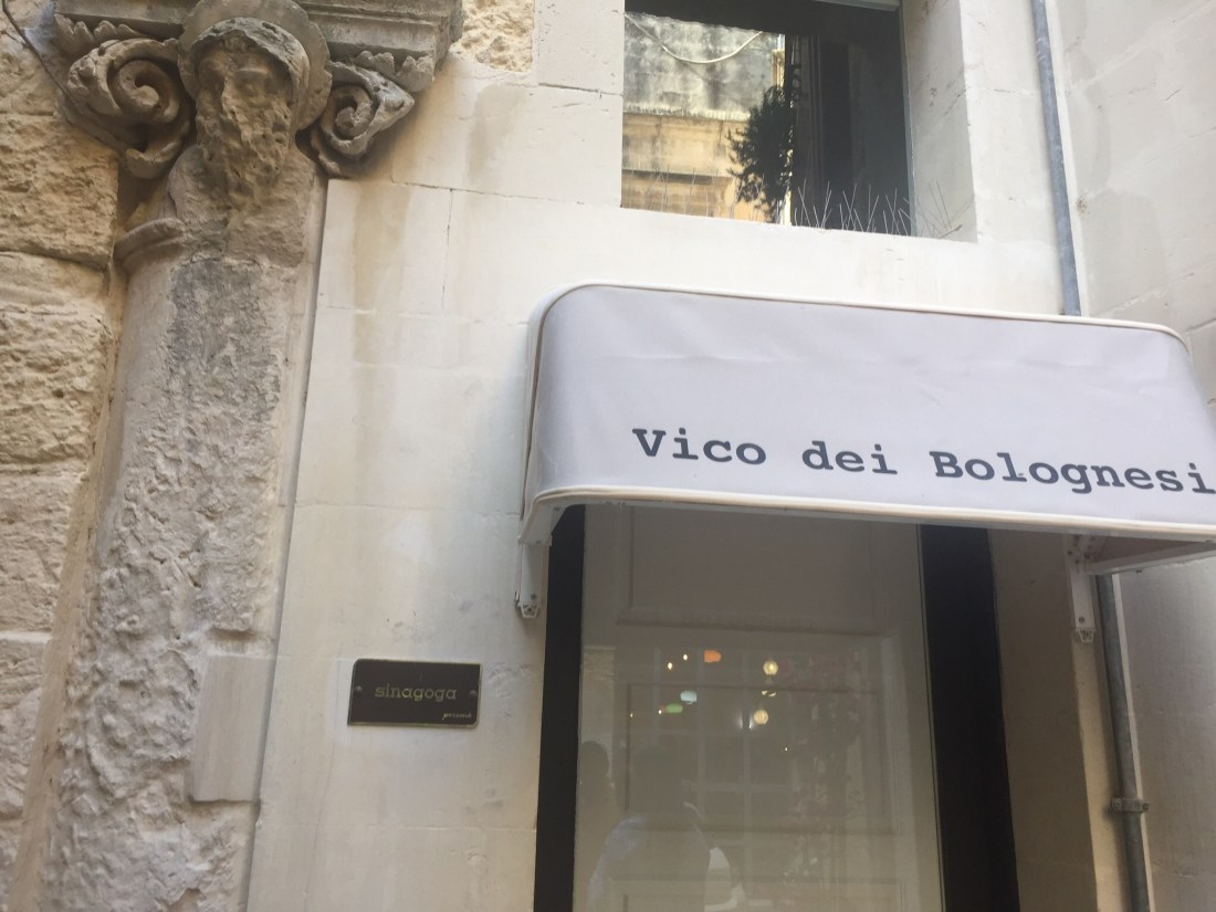 Выйдя из «подземелья» мы прежде всего увидели громаду церквиСанта Кроче, специально выстроенную на месте разрушенных еврейских жилищ, , а потом на окрестных улочках определили, где был еврейский квартал — единственное место на юге Италии, где название улицы было написано на двух языках — רחוב בית הכנסת