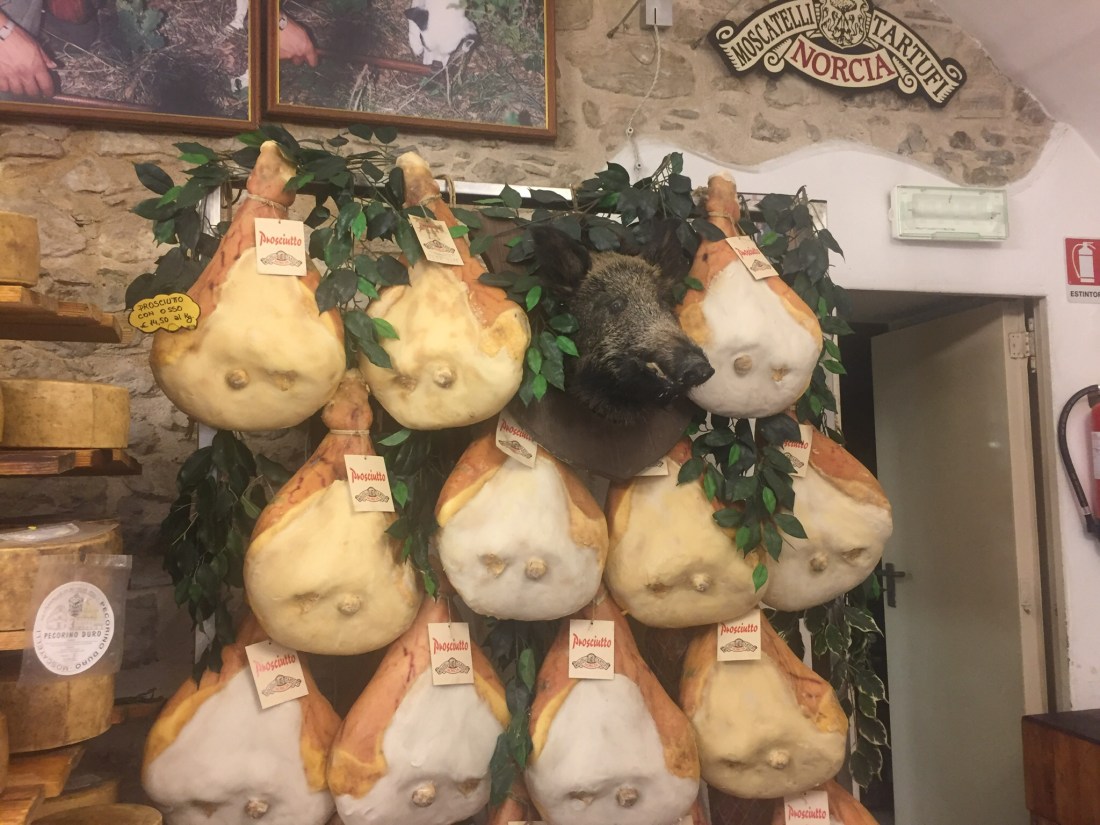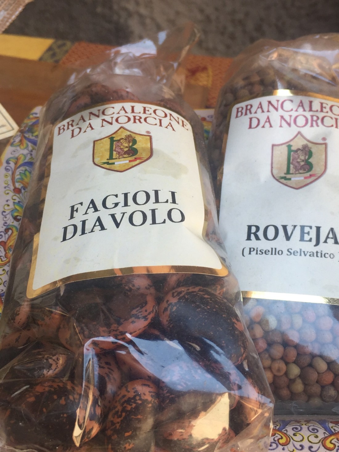 Норча пахнет. Здесь совсем не так пустынно и стерильно чисто, как в маленьких борго этим знойным днём. Запах выдержанных сыров, ветчина, вяленая, жареная и какая то там ещё кабанина, ведра со знам нитыми бобовыми выставлены прямо на улицах у дверей магазинов. Никогда не видела такого разнообразия — фасоль огромная темная с разводами сорта diabolo, фасоль мелкая с темными глазками, фасоль чёрная, хумус, чечевица разных размеров.