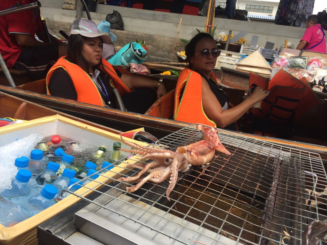 а вот потом началось истинное столпотворение — мы прибыли на центральный Grand Canal, а там… десятки плоскодонок с фруктами, уже нарезанными в коробочках, жареные куры, свинина и осьминоги, кокосы с оттрубленными головами…