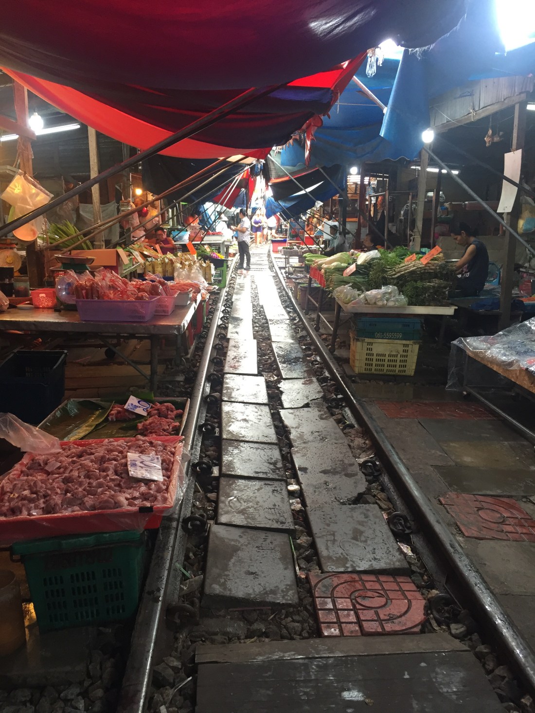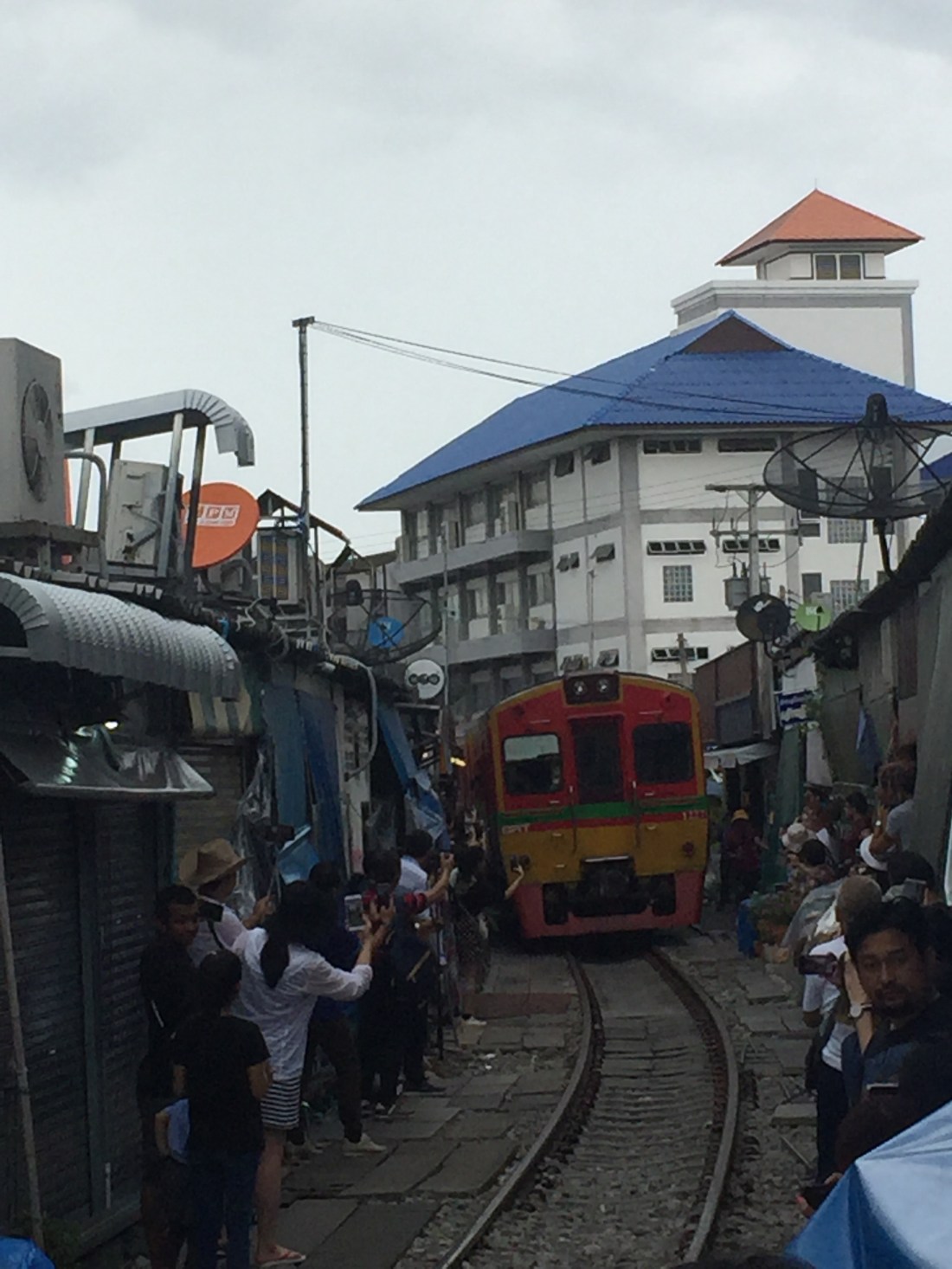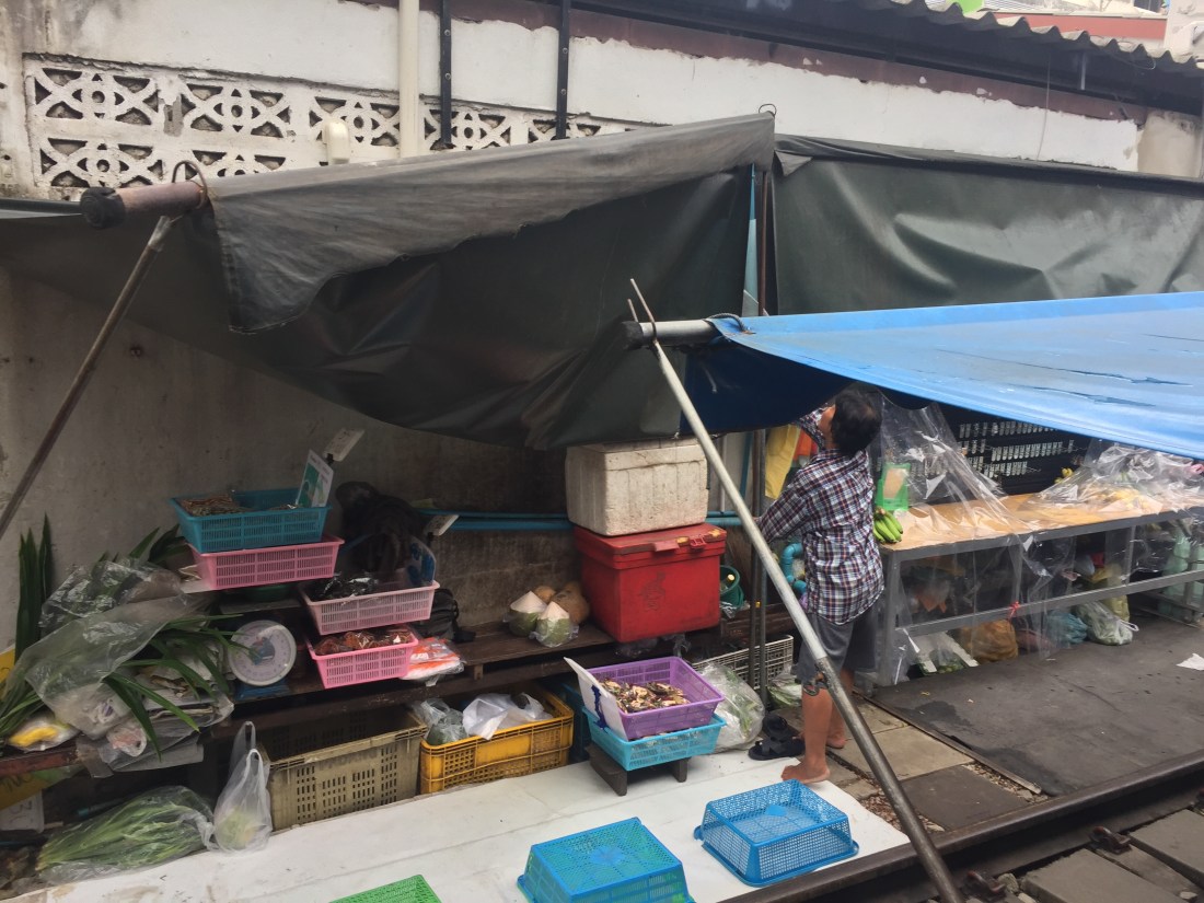 Наша гид об’яснила, что иначе мы не сможем насладиться главной аттракцией этого рынка — посмотреть, как прямо перед приходом поезда все торговцы моментально «схлопывают» свои «маркизы» над лотками, быстро убирают товары с дороги и выстраиваются вдоль рейсов, зорко высматривая, чтобы бестолковые туристы не помешали движению локомотива