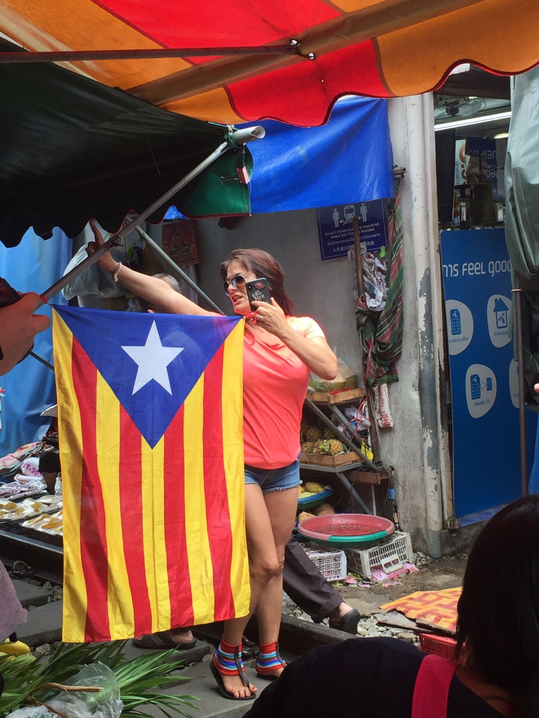 туристы поопытнее успевают установить камеру прямо между рельсами и даже сфотографироваться с национальными флагами, как эти ребята из Каталонии