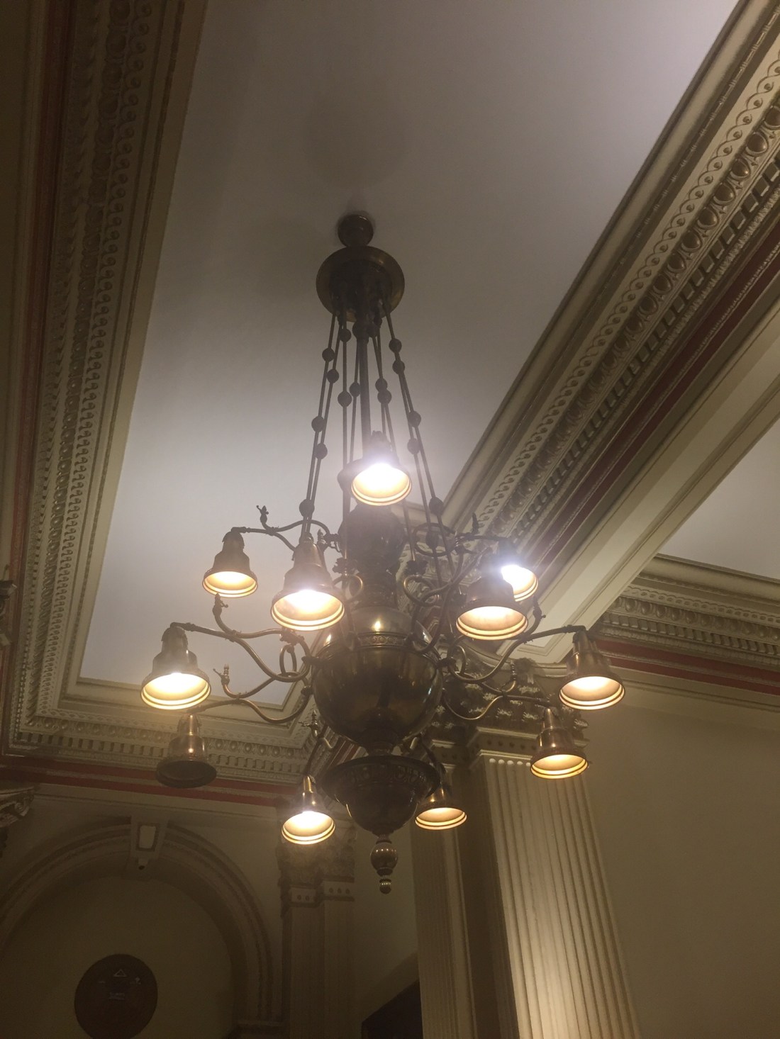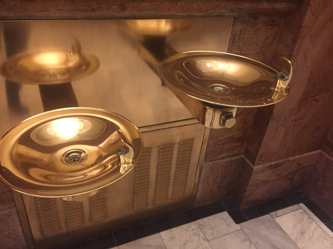 Ощущение солидности и богатства подпитывается «золотой» отделкой. Светильники, люстры, балконы, даже фонтанчики для питья выполненные из бронзы и латуни выглядят как старое, благородное, без дешёвого блеска настоящее золото.
