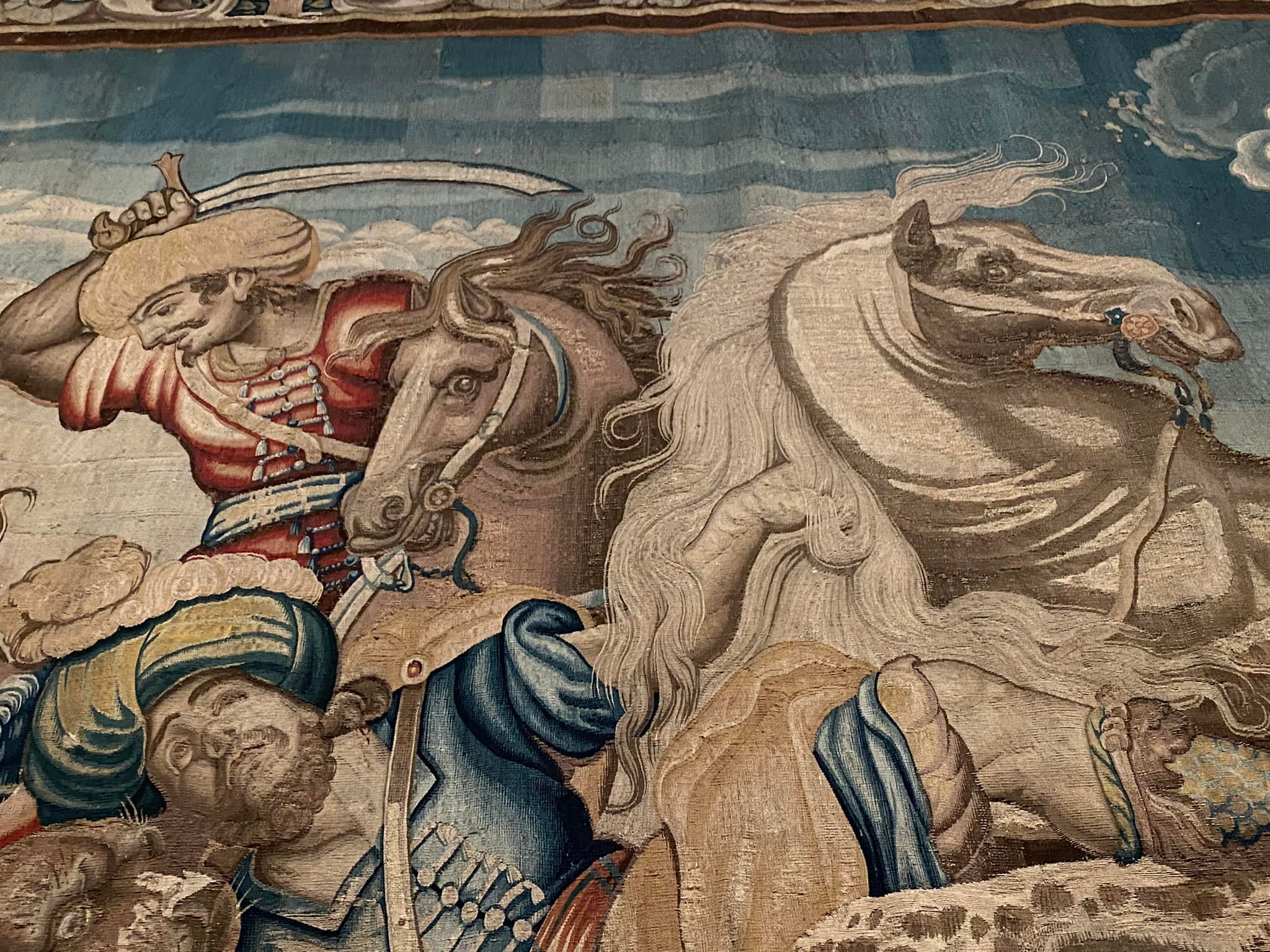 На верхних этажах ожидаемое убранство средневековья, гобелены, резные шкафы, портреты и датский королевский фарфор