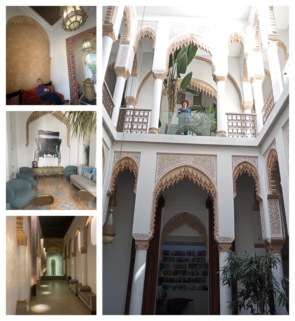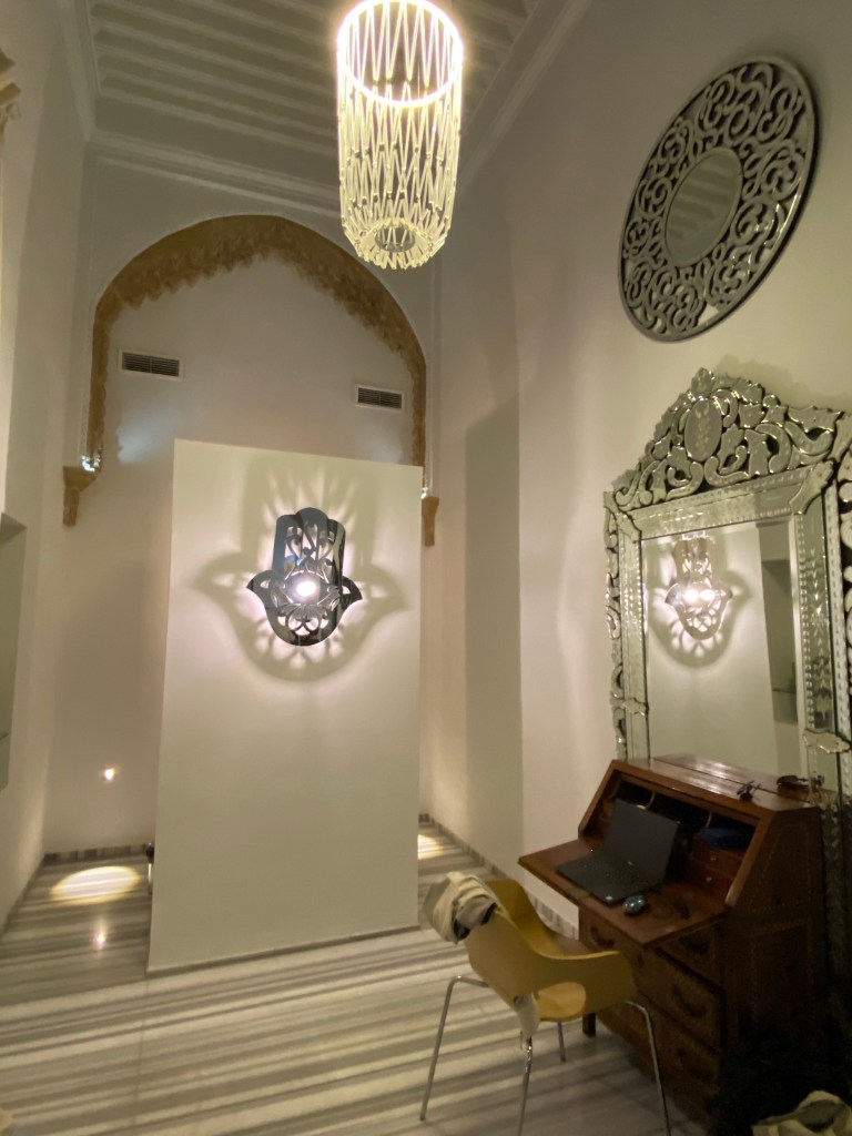 Риад — или постоялый двор — в прошлом обычный дом для большой семьи с обязательным центральным двориком, где семья собиралась у фонтана, и с обязательным открытым верхом, чтобы видеть небо и иметь доступ свежего воздуха. Помним, что в мусульманских обычаях не принято выделяться наружными стенами, и совсем почти не окон, разве что небольшие, забранные изящными решетками на высоте нескольких метров.