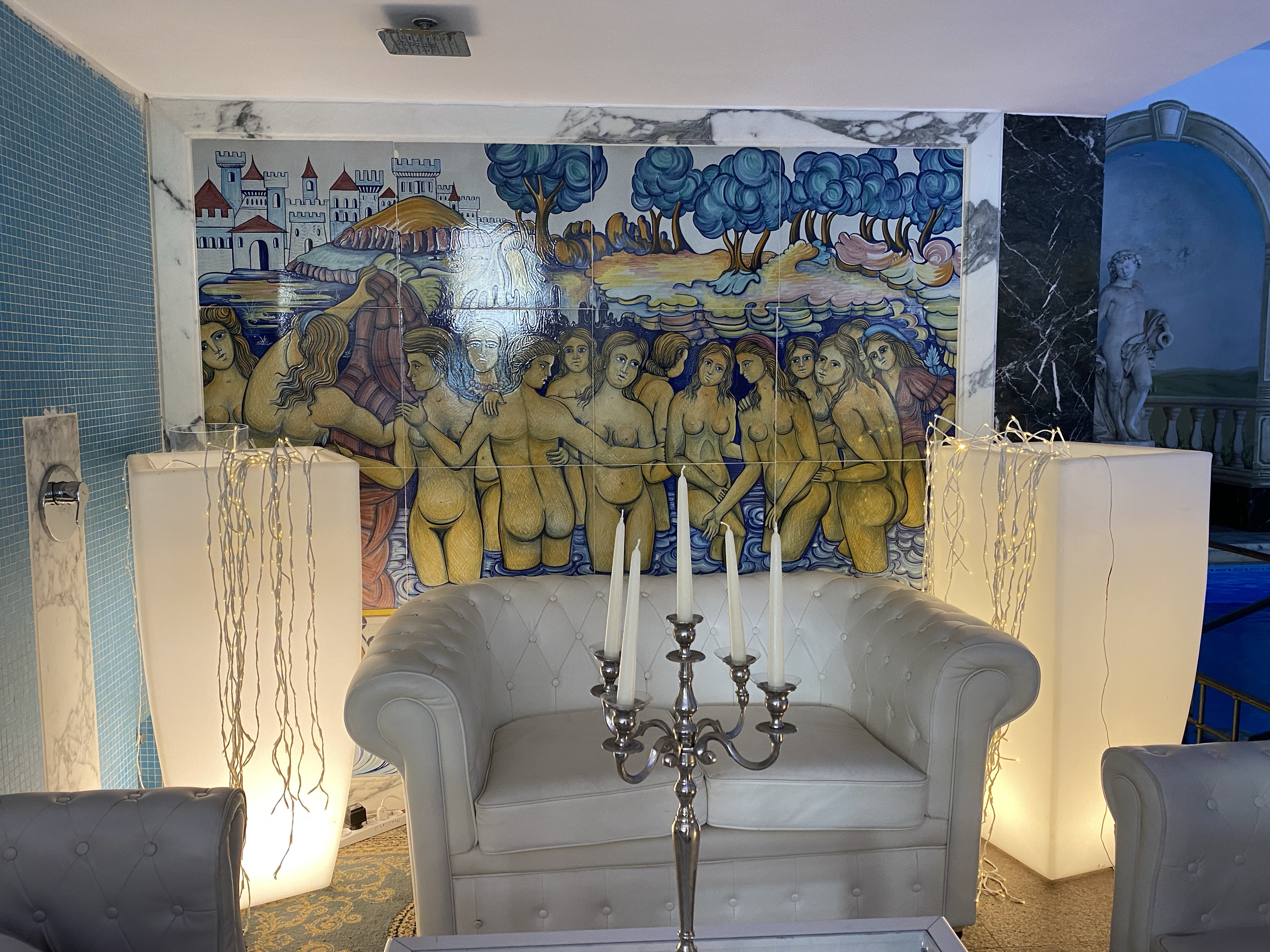 Комнаты отеля довольно скромные, зато завтраки нам накрывали просто в лукулловом стиле, в огромном зале приёмов рядом с бассейном, где современные витражи напоминали о древних весталках.