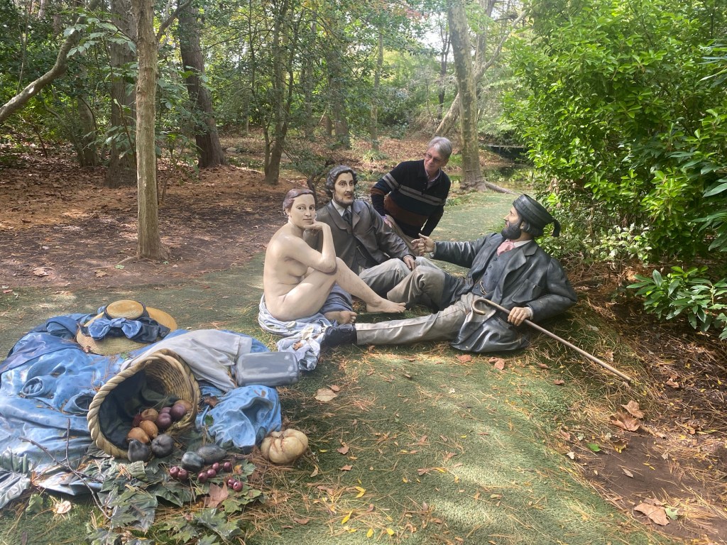 А вот за кустиками расположилась на пикник живописная группа молодых людей с обнаженной дамой на первом плане, в которой без ошибки узнается «Завтрак на траве» Эдуарда Мане.